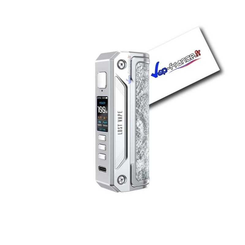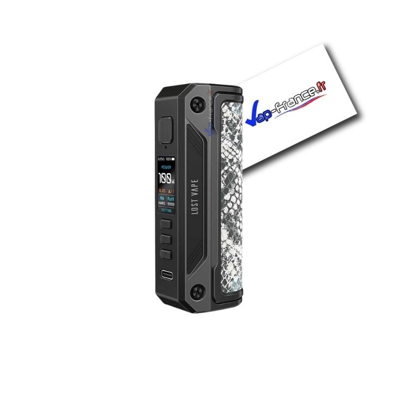 Est-il vraiment nécessaire de rappeler les caractéristiques de la box Thelema ? Ce modèle phare de chez Lost Vape a été réédité à maintes reprises avec des designs magnifiques. Pour les dimensions, on retrouve le format classique de la Thelema, avec 97,5 x 39 x 28,5mm pour un poids de 150g, offrant une prise en main agréable et ergonomique.